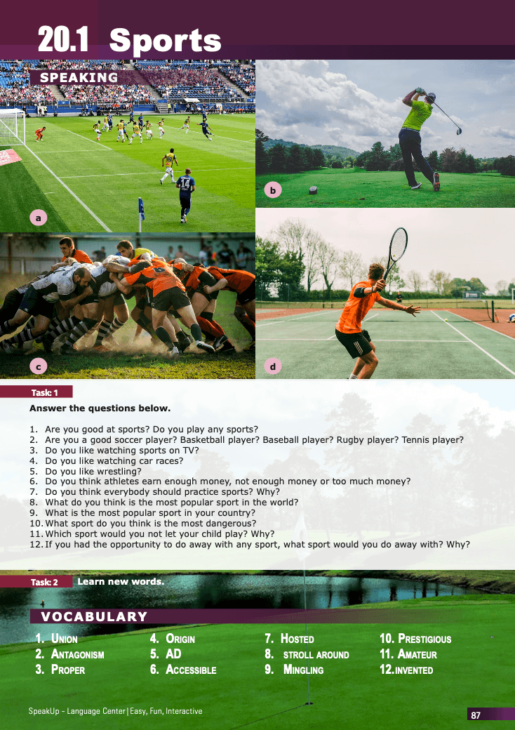 Considering the above-mentioned facts, we decided to create this manual comprising multitude of interesting articles and video resources aiming at upgrading proficiency in speaking, listening and reading competencies. 20 special units encompass questions concerning the certain topic and provides you with the opportunity to express yourself, speak about your hobbies, interests, participate in discussions and converse with firm arguments about multiple issues.